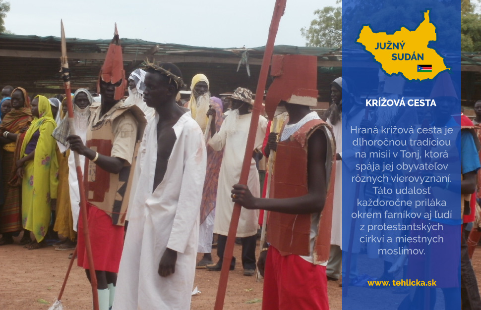 Tradíciou na misii v Tonj je každoročná hraná krížová cesta, ktorej sa zúčastňujú všetci obyvatelia Tonju, od malých až po dospelých. Do prípravy sú zapojení aj žiaci a študenti z Edukačného centra sv. Bakhity. Krížová cesta sa odohráva v prašných uličkách medzi malými hlinenými domami, pomedzi ktoré pobehujú kozy, ovce či pasúce sa kravy. Táto udalosť každoročne priláka okrem miestnych farníkov aj ľudí z protestantských cirkví a miestnych moslimov. Tak sa spoločne celé mesto pripravuje na nadchádzajúce slávenie veľkonočných sviatkov. Je to udalosť, ktorá spája ľudí z rôznych kmeňov, vierovyznaní a rôzneho veku.